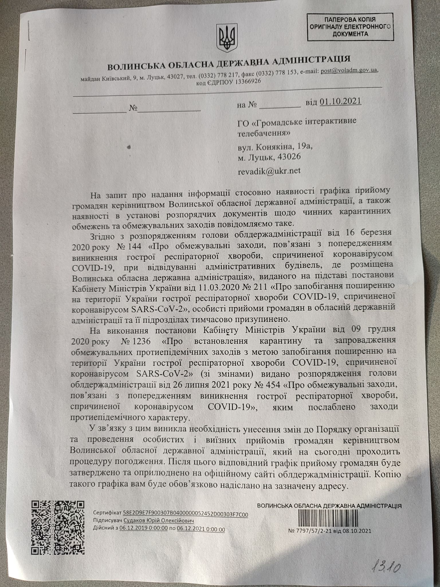 Про це стало відомо з відповіді Волинської облдержадміністрації на запит кореспондента ГІТу щодо наявності графіка прийому громадян головою ОДА.
