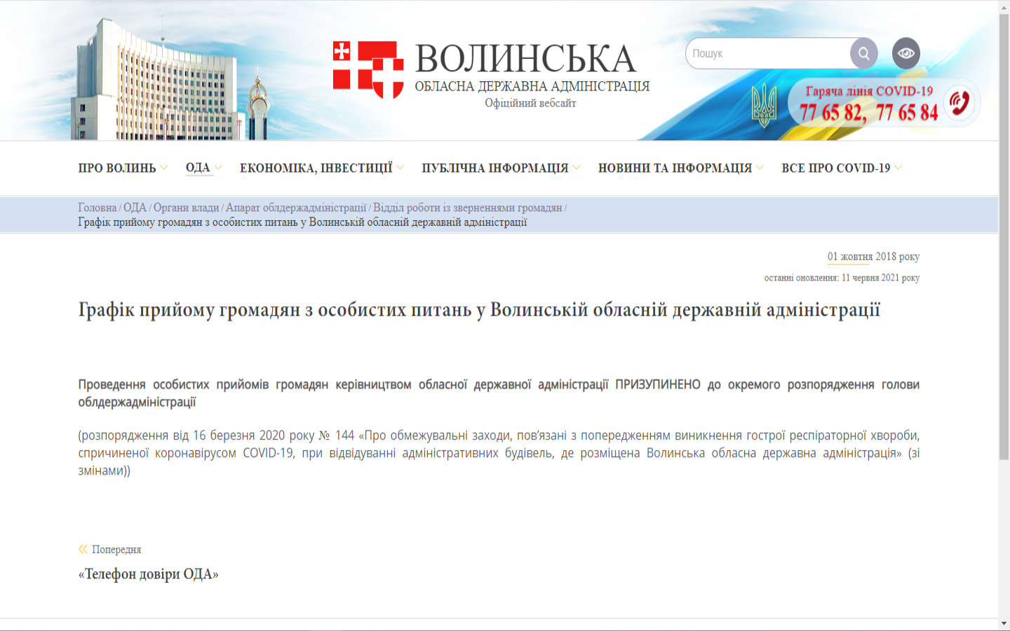 Зазначимо, що з усіх органів влади, структурних підрозділів, державних установ та організацій, екстрених служб і комунальних підприємств області графіку особистого прийому громадян керівництвом нема лише у Волинської облдержадміністрації.