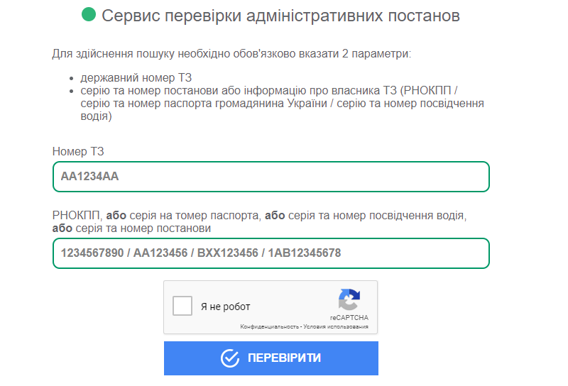 Користувач повинен вказати номер свого транспортного засобу, а також серію і номер постанови або інформацію про власника ТЗ. Йдеться про паспортні дані, або посвідчення водія.