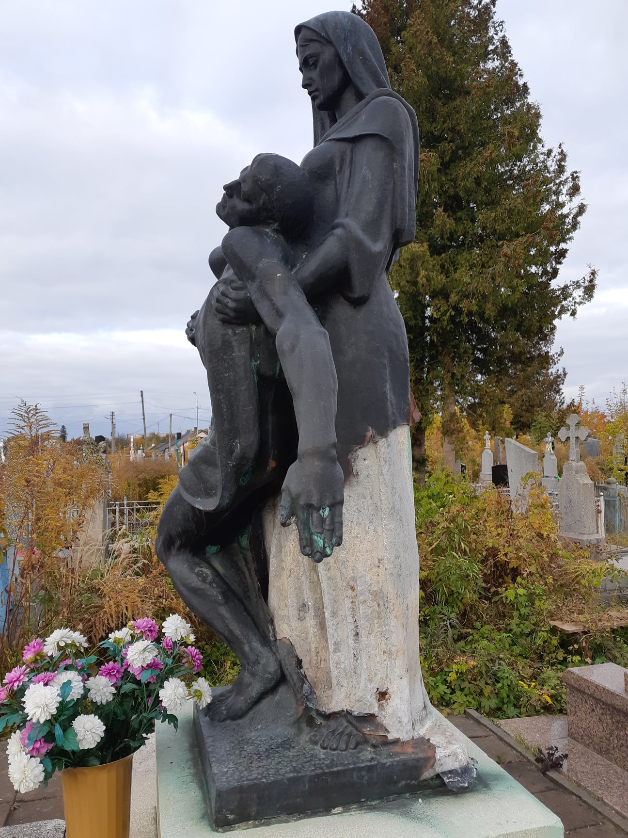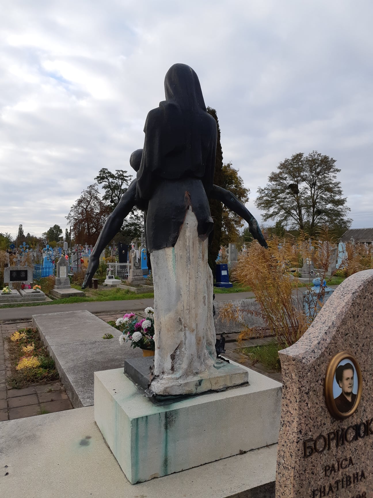 «Сьогодні (16 жовтня – ред.) прибирав на Лодомирському цвинтарі Володимира могили родини. З обуренням відзначив, що за три місяці вандали «роздягнули», «розтягнули» бронзу на скульптурі жінки, колективного поховання солдат, які загинули у роки ІІ Світової війни. Три місяці тому цього не було… Пам’ятаю, цілою скульптуру на пам’ятнику солдатам, які загинули 1914 р. Нині вона стоїть без рук та без меча… Обидва пам’ятники знаходяться на центральній алеї. Поліції варто було б подбати про притягнення до відповідальності недоумків!!! За ч.2 ст.297 (осквернення або руйнування могили) КК України передбачено санкцію у вигляді обмеження волі на строк від трьох до п’яти років або позбавлення волі на той самий строк», – коментує фото автор.