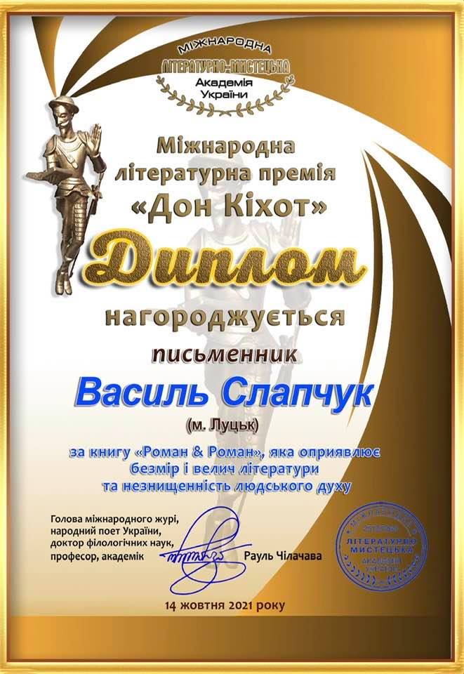 Поет та письменник з Луцька Василь Слапчук отримав Міжнародну літературну премію «Дон Кіхот» за книгу «Роман&Роман».