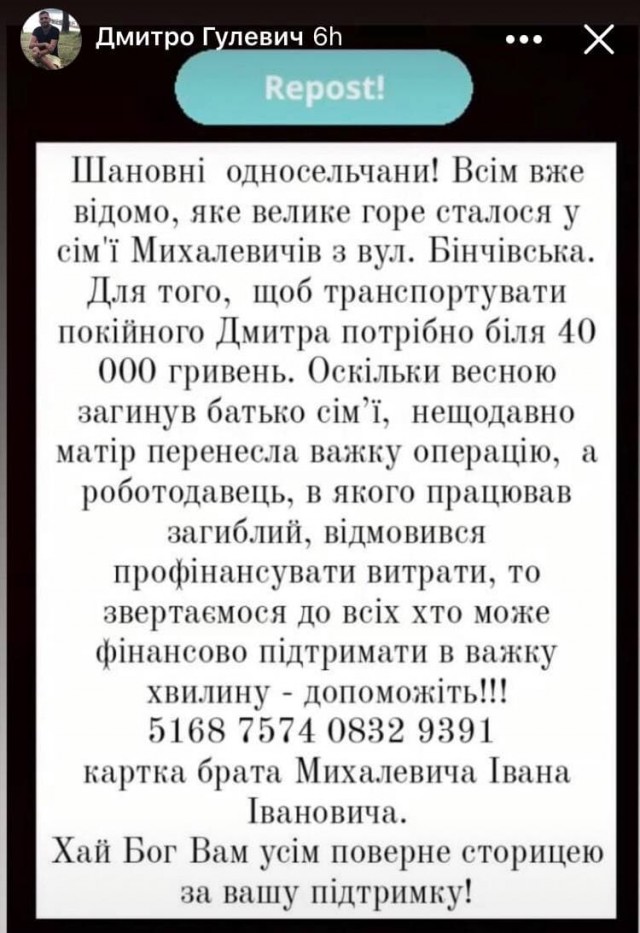 Відомо, що роботодавець відмовився профінансувати витрати, тому рідні звертаються до всіх небайдужих з проханням допомогти. Щоб перевезти тіло у рідне село потрібно зібрати близько 40 000 тисяч гривень.