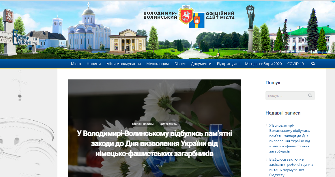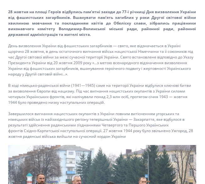 Зокрема, у публікації під заголовком «У Володимирі-Волинському відбулись пам’ятні заходи до Дня визволення України від німецько-фашистських загарбників» йдеться: