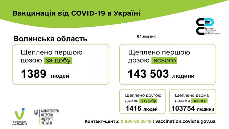 За добу 07 жовтня 2021 року проти COVID-19 в області проведено 2805 щеплень. Першою дозою щеплено 1389 осіб та другою дозою – 1416 осіб.