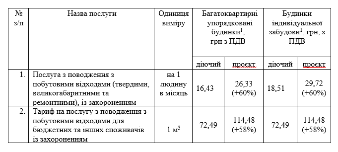 Послуга з поводження з побутовими відходами (твердими, великогабаритними та ремонтними), із захороненням на одну людину в місяць для мешканців багатоквартирних упорядкованих будинків становитиме 26,33 грн з ПДВ (нині 16,43 грн), а для мешканців будинків індивідуальної забудови – 29,72 грн з ПДВ (нині 18,51 грн).