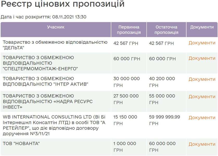 Участь в аукціоні взяли 6 компаній. Стартова ціна лоту була 42 567 гривень. Протягом торгів вона зросла до 60 мільйонів гривень. Таку суму запропонувало київське ТОВ «Нованта», статутний капітал якого становить 1 тисячу гривень.