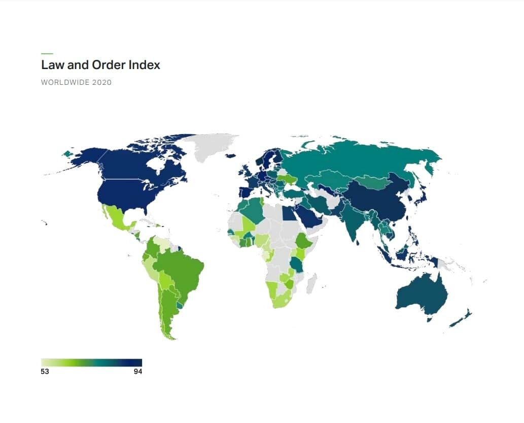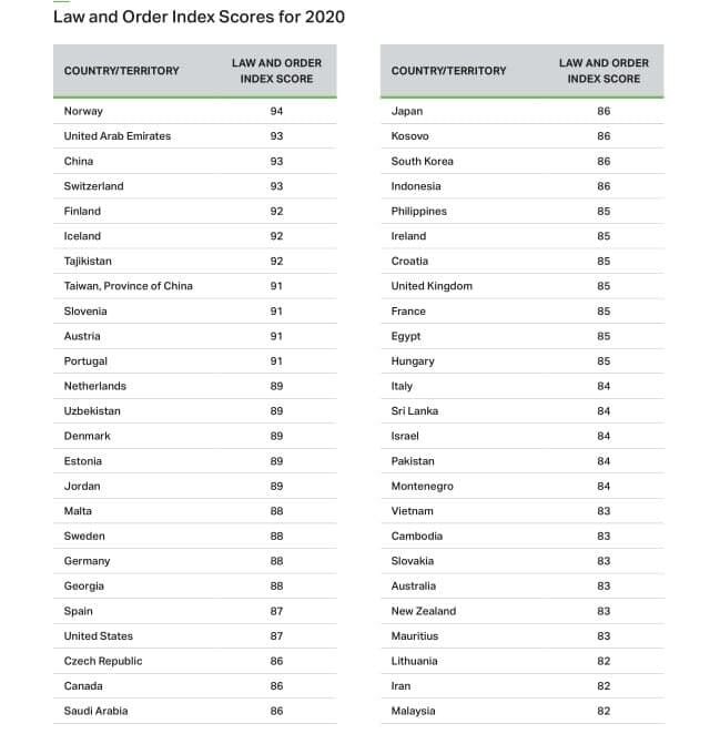 До речі, минулого року середньосвітовий параметр становив 82 із 100 очок. Мається на увазі відповіді на вищезгадані питання, які перетворилися на окуляри. Чим вищий їхній показник, тим населення почувається безпечніше. У 2020 році безпечною країною визнали Норвегію (94), а Венесуелу та Габон найнебезпечнішою (53).