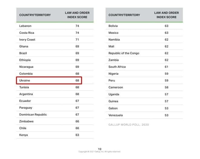 Американський інститут громадської думки «Gallup» опублікував щорічну доповідь «Глобальний закон і порядок» за 2021 рік, в якій Україна посіла 68 місце, що нижче за такі країни, як Колумбія, Ефіопія, Ірак та інші.