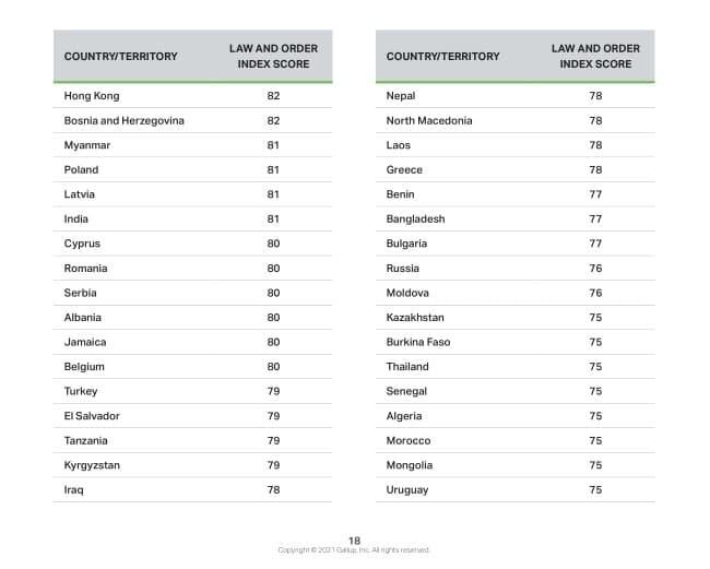 Таких висновків дійшов «Gallup» після опитування людей віком від 15 років і старше зі 115 країн. Загалом у дослідженні взяли участь понад 120 тисяч осіб, які дали відповіді на запитання – чи довіряють вони місцевій поліції, чи стикалися з крадіжкою, розбоєм чи грабунком за останні 12 місяців, а також чи бояться вони ходити ночами у своєму районі.