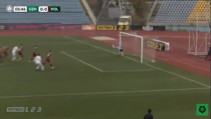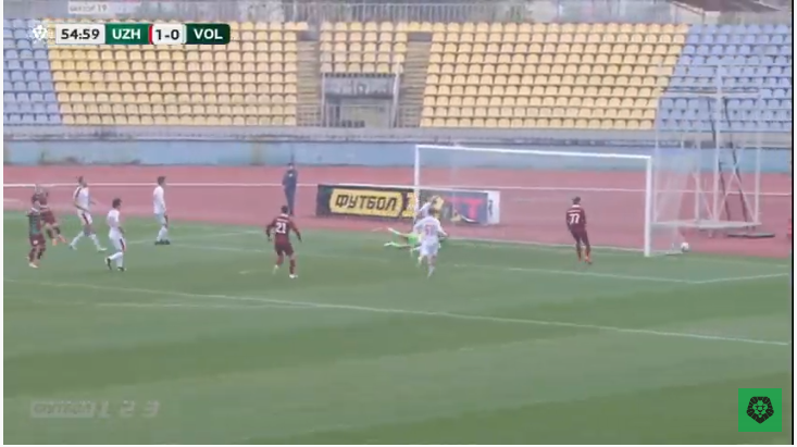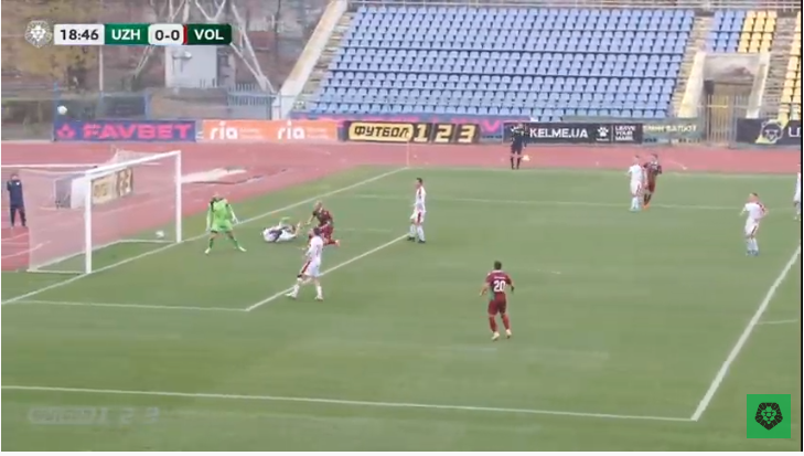 По закінченні першої третини тайму ужгородці перевели гру ближче до воріт «Волині», і на 19-й хвилині вихованець волинського футболу Віктор Хомченко небезпечно пробивав із меж штрафного майданчика – м’яч ковзнув по поперечині і полетів за межі поля.