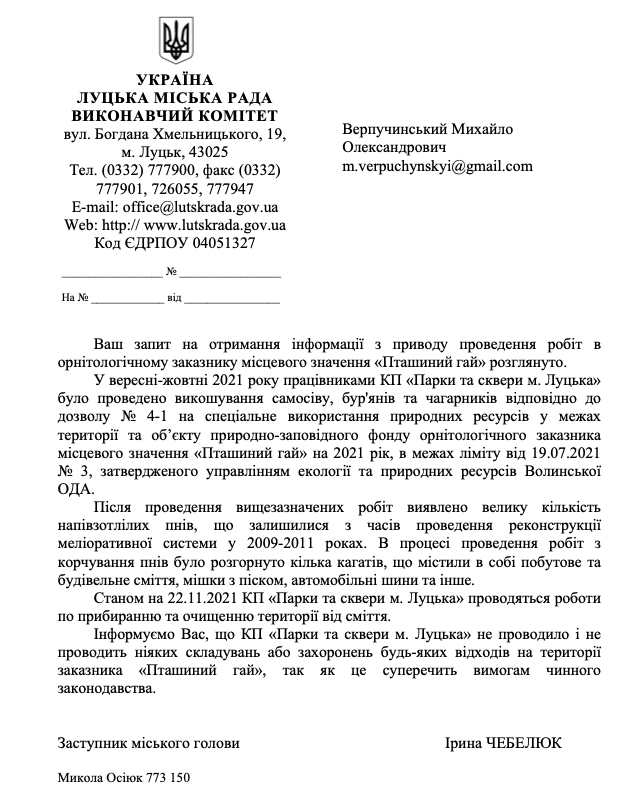 Луцька міська рада надіслала відповідь на запит луцького активіста Михайла Верпучинського щодо закопаного в орнітологічному заказнику «Пташиний гай» будівельного сміття.