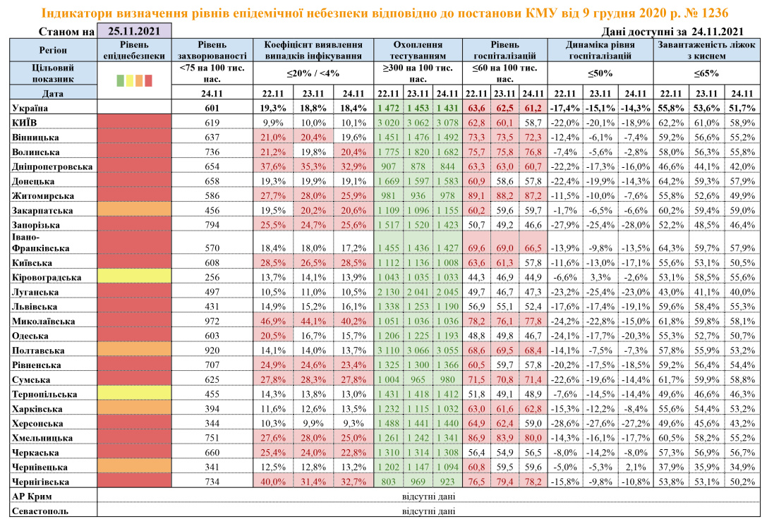 Станом на 25 листопада в червоній зоні епіднебезпеки знаходяться Київ та 18 областей.