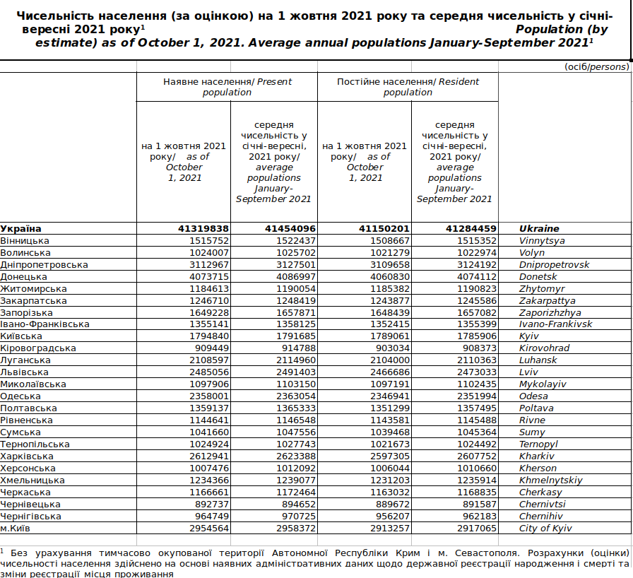 За оцінками Укрстату, на 1 жовтня 2021 року чисельність населення становила 41 319 838 осіб. Це означає, що за січень-вересень 2021 року населення зменшилося на 268,5 тисячі осіб.
