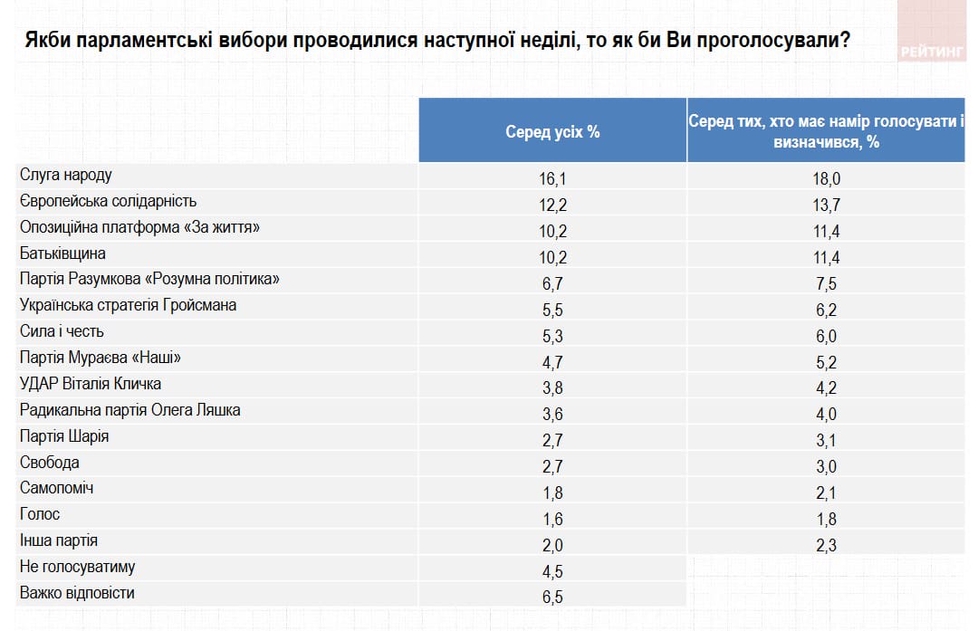 З дослідження випливає, що рейтинг партій виглядає так: