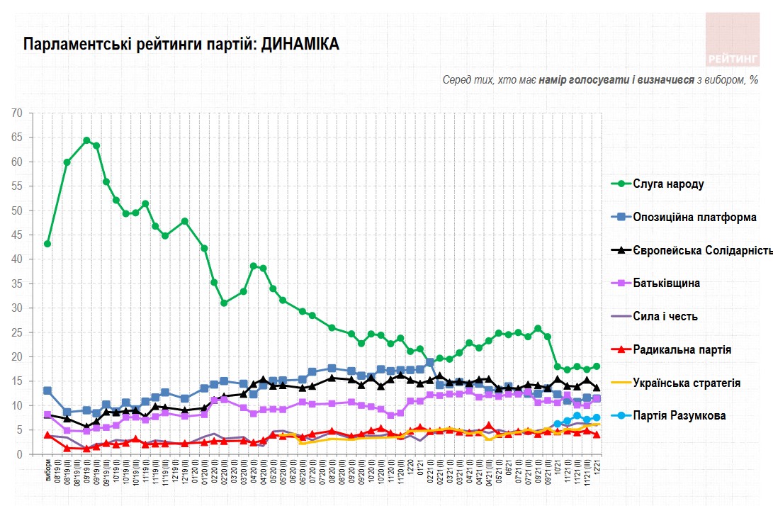 З графіку опитування також видно, що з листопада рейтинг «слуг» трохи підсилився, у «ЄС», навпаки, ослаб. Підтримка «Батьківщини», Разумкова і Гройсмана дещо зросла. В ОПЗЖ рейтинг майже не змінився.