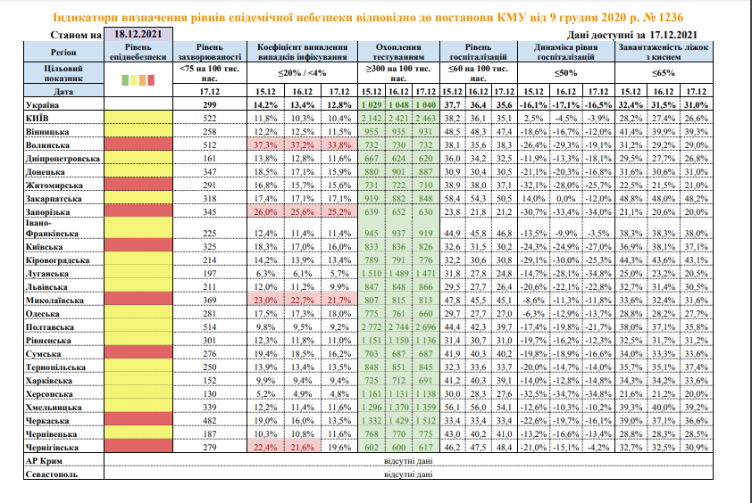 Найвищий показник рівня захворюваності станом на 17 грудня зафіксований у Києві — 522 при показнику <75 на 100 тис. нас., найнижчий — у Херсонській (130).