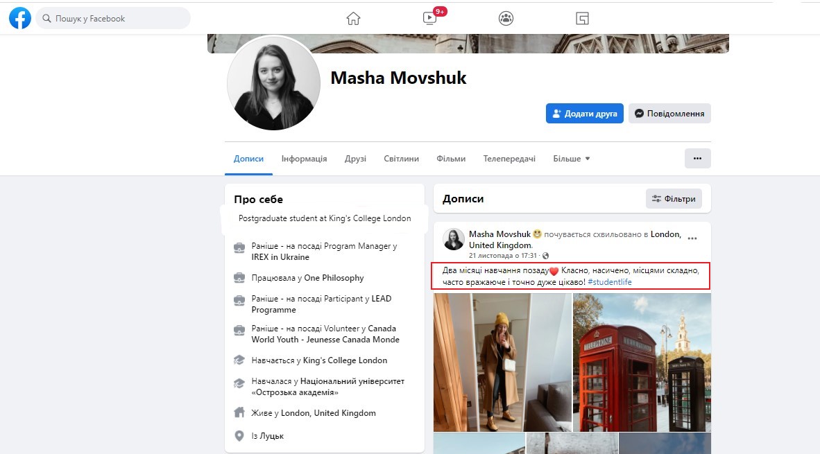 Так, наприклад, 25-річна донька СБУшника Марія нині навчається у бізнес-школі Королівського коледжу у Лондоні, де вивчає публічну політику та управління. Але стиль її життя ніяк не ототожнюється зі студентством.
