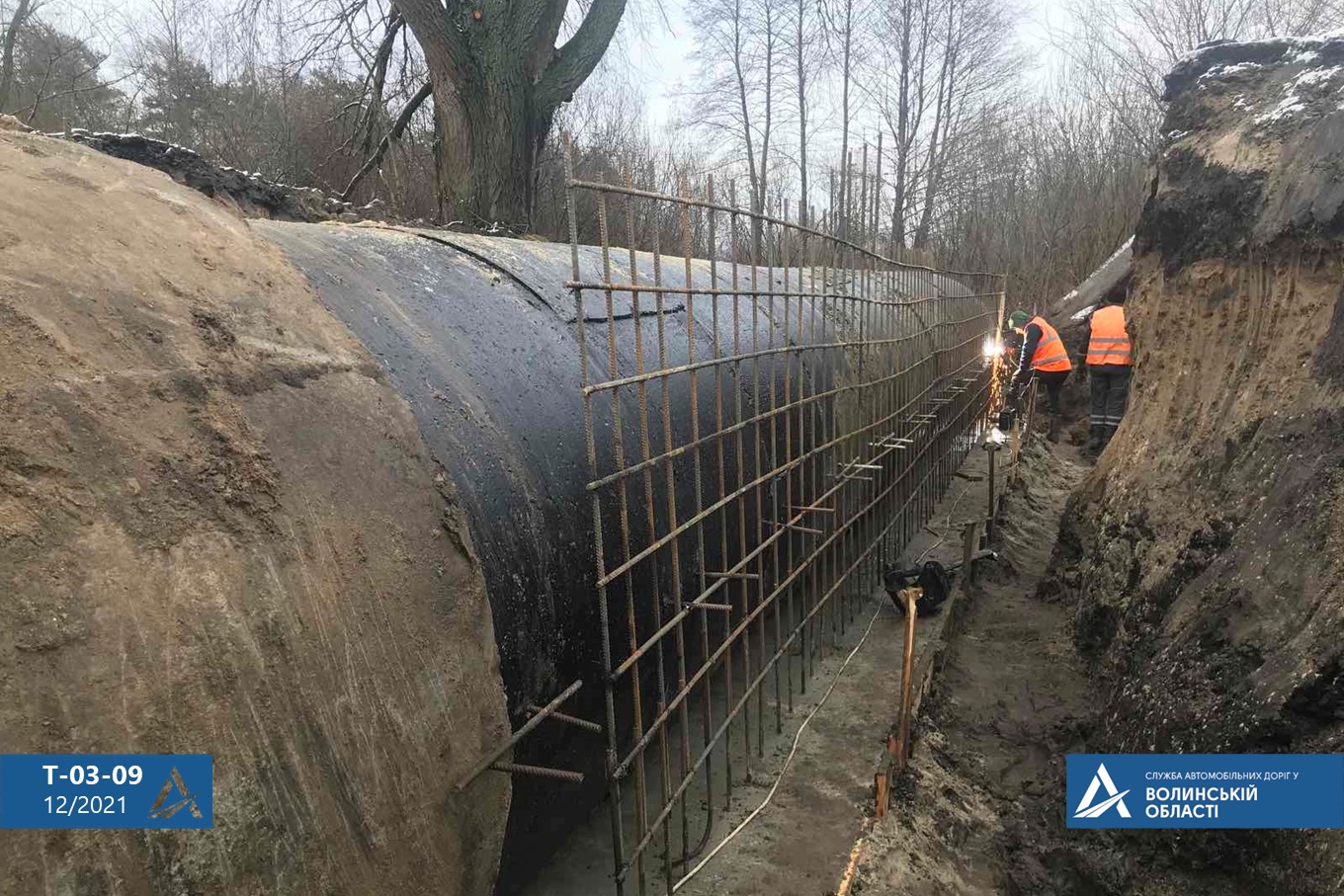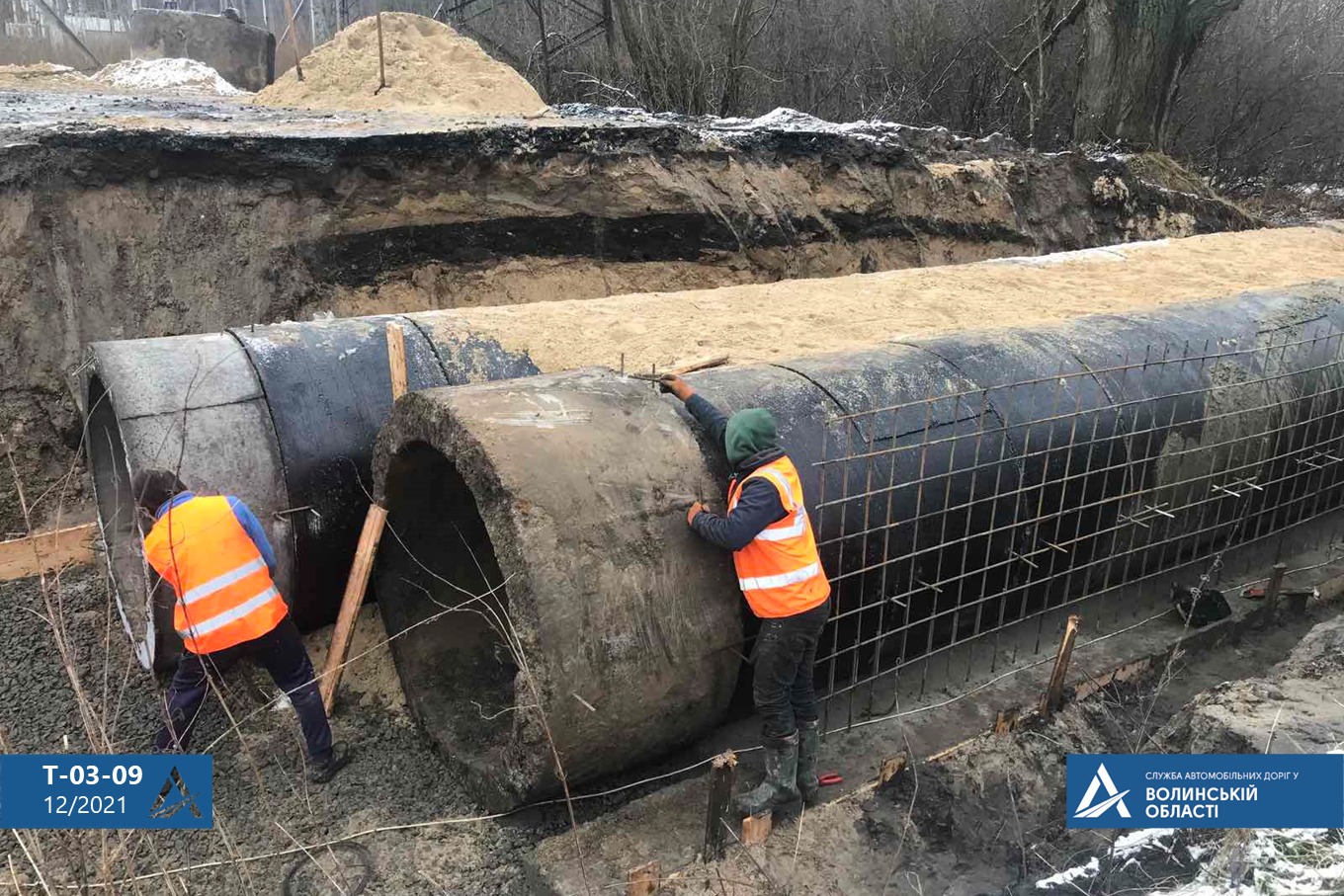 Роботи з ремонту 2-очкової водопропускної залізобетонної труби завдовжки 12 м, діаметром 1,5 м кожна виконує субпідрядне підприємство ТзОВ «РБП ТРАНС-МОСТ».