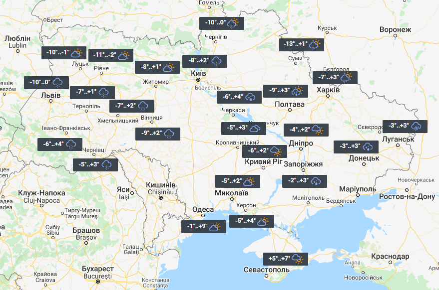 На півночі сьогодні повітря прогріється до 0°...+2°, переважатиме невелика хмарність. Скрізь, крім Житомира, очікуються опади у вигляді снігу та мокрого снігу.