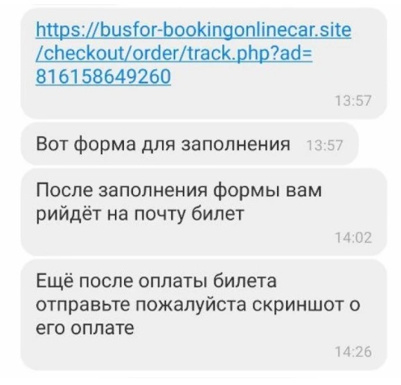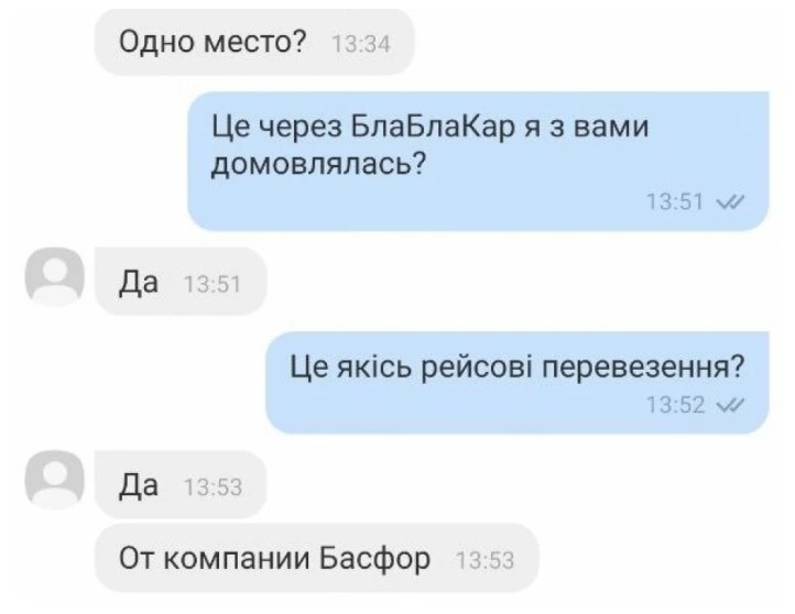 Водій повідомив, що представляє фірму Бусфор, тож перевезення регулярні та бусом, але для того, щоб замовити місце, необхідно оплатити за квиток онлайн. Він надіслав посилання, на яке відкрилася форма, де потрібно було вказати: прізвище, ім'я, електронну пошту, на яку пришлють квиток, та номер телефону. Окрім цього, тут необхідно ввести дані платіжної карти для миттєвої оплати квитка. Посилання дійсно було з бусфор.