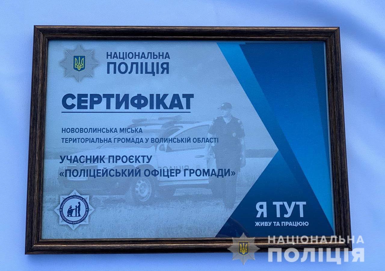 Голова громади отримав від головного поліцейського області сертифікат учасника проєкту «Поліцейський офіцер громади», що є свідченням подальшої взаємодії зі зміцнення безпекового середовища на території Нововолинська та прилеглих населених пунктів.