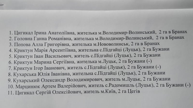 Проте у списку навпроти кожного прізвища зазначено площу (2 гектари) і населений пункт, де цій людині мають виділити землю.