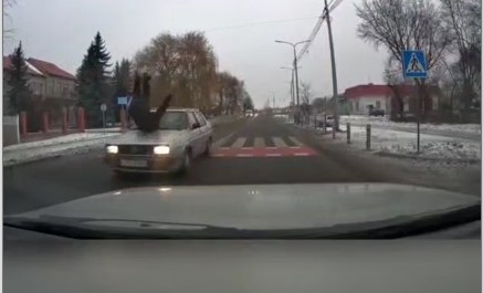На відео видно, як чоловік переходить дорогу по пішохідному переході, водій легковика навіть не намагається загальмувати, лише трохи повертає кермо ліворуч. Як наслідок, чоловік опинився на капоті й перекинувся на лобове скло.