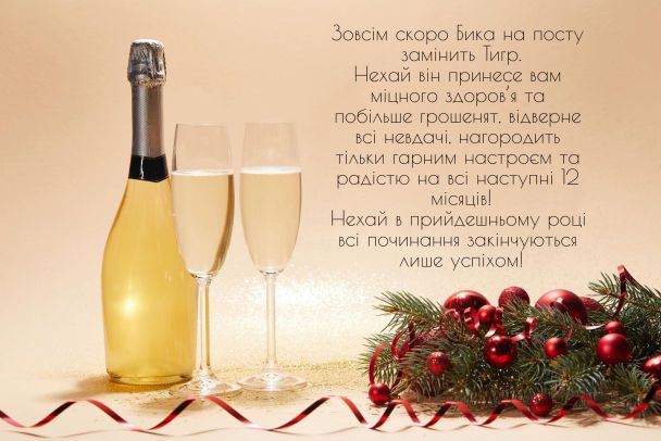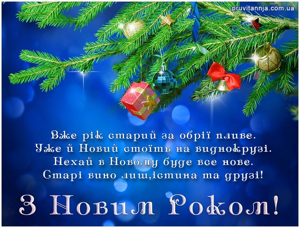 Вітаю вас з прийдешнім Новим роком! Нехай життя іскриться, як повний келих смачного шампанського. Нехай здоров’я міцним, як п’ятизірковий коньяк. Бажаю тобі у прийдешньому році, щоби “зелених” в гаманці було більше, ніж голок на новорічній ялинці. На душі хай буде тепло і затишно, як у мороз біля каміна. Благополуччя і радості майбутньому році