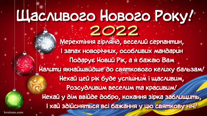 З Новим Роком! Хай світле новорічне свято увійде у Ваше життя і принесе з собою здоров’я, достаток і приємні сюрпризи. Бажаю вам щодня знаходити привід для посмішки і завжди відчувати себе закоханим у життя!