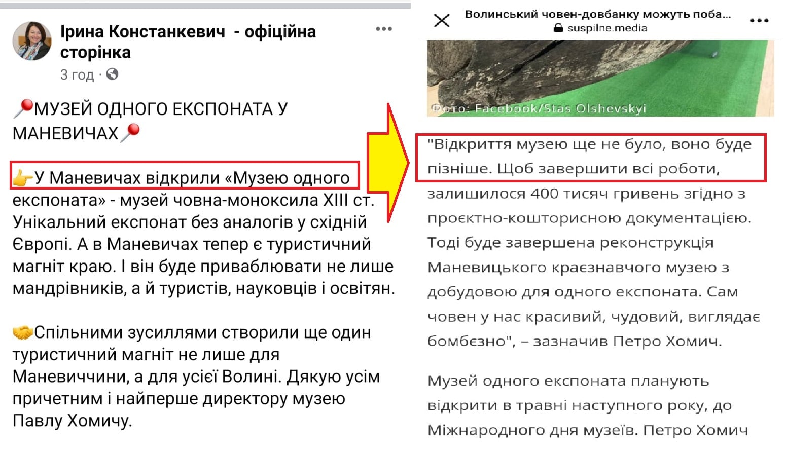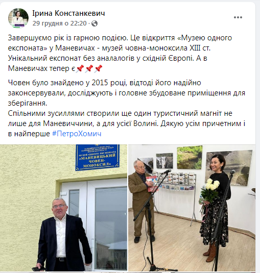 Народний депутат України Ірина Констанкевич заради власної похвальби написала на своїй офіційній сторінці у фейсбуці, що «у Маневичах відкрили «Музею одного експоната» – музей човна-моноксила ХIII ст.», хоча насправді офіційного відкриття музею ще не було – його відкриють у травні 2022 року.