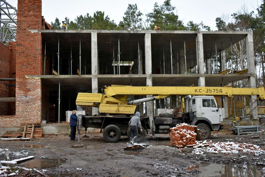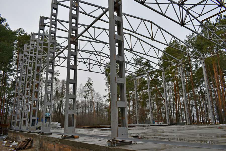 Роботи стартували в серпні цього року в межах програми «Велике будівництво». На даний час встановлені спеціальні металеві конструкції, необхідні для облаштування стін спортивного залу, та зведені два поверхи господарської споруди (загалом передбачено три поверхи).