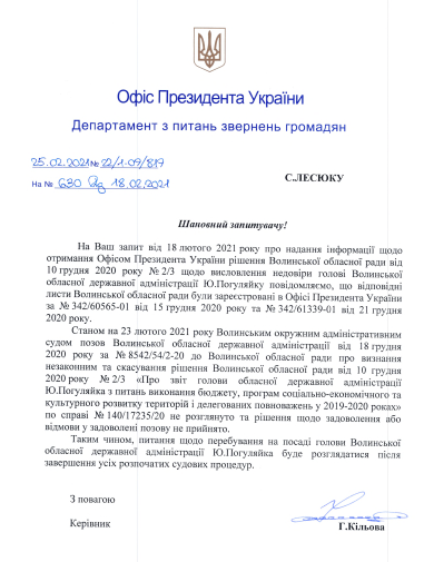 Вісімнадцятого лютого 2021 року журналіст надіслав інформаційний запит в Офіс Президента України, в якому попросив повідомити, чи отримав Офіс Президента рішення Волинської обласної ради «Про звіт голови Волинської обласної державної адміністрації Ю.Погуляйка з питань виконання бюджету, програм соціально-економічного та культурного розвитку територій і делегованих повноважень у 2019-2020 роках».