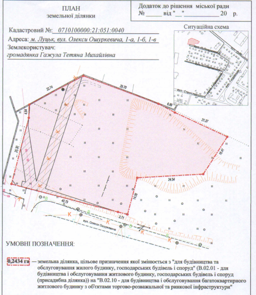 У Луцьку скандальна забудовниця Тетяна Гажула просить змінити цільове призначення землі для будівництва багатоквартирного будинку в приватному секторі на вул. Олекси Ошуркевича, 1-а, 1-б, 1-в.