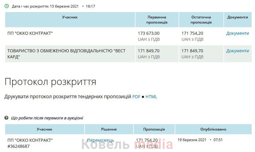 Переможцем тендеру стало київське приватне підприємство «ОККО-Контракт», яке запропонувало найменшу ціну – 171 754,20 грн з ПДВ. Інший учасник торгів – луцьке ТОВ «Вест Кард» – пропонував 171 849,70 грн з ПДВ.