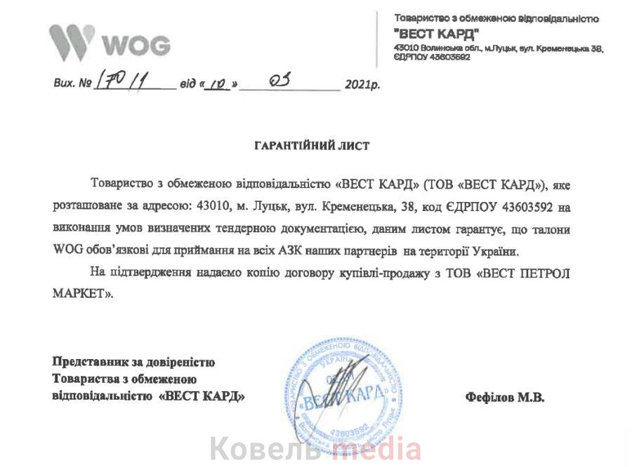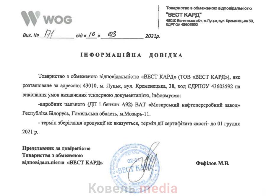 Перед проведенням аукціону провідний менеджер цієї фірми із збуту та її представник за довіреністю Максим Фефілов в інформаційній довідці, яка була надана організатору торгів, зазначив, що виробником дизпалива та бензину А-92 (хоч виконком купував А-95 Євро) є Мозирський нафтопереробний завод у Республіці Білорусь, а талони WOG – обов’язкові для приймання на всіх АЗК партнерів ТОВ «Вест Кард» на території України. І навіть вказав, що фірма має в Ковелі орендоване приміщення під офіс.