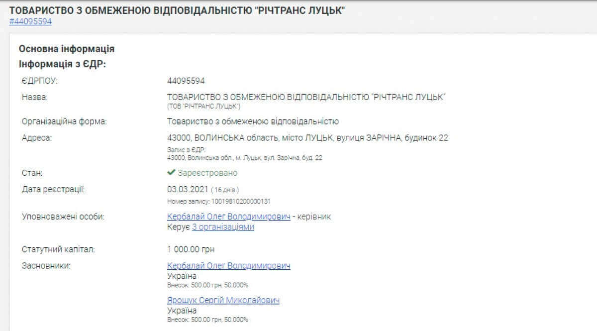 ТОВ «Річтранс Луцьк» створене 3 березня 2021р. Статуний капітал фірми – 1000 грн.