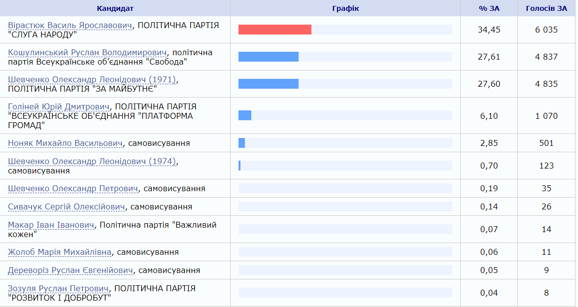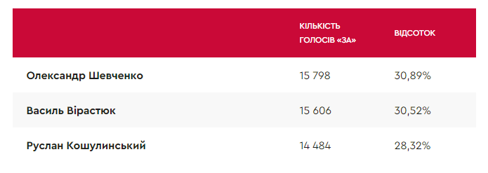 Результати першої трійки учасників перегонів, за даними штабу Шевченка, мають такий вигляд: