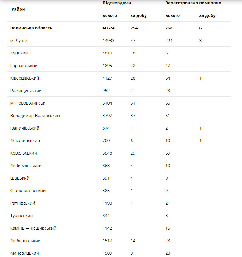 За останню добу на Волині зареєстровано 254 нових підтверджених випадки коронавірусної хвороби COVID-19 (з них дітей – 12, медпрацівників – 14). Одужало за добу – 57 осіб, летальних випадків – 6.