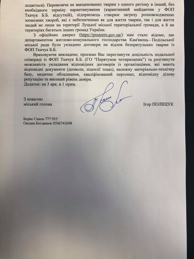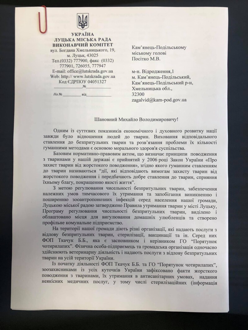 Луцький міський голова Ігор Поліщук направив звернення до своїх колег з інших населених пунктів України з проханням щодо припинення співпраці з відлову безпритульних тварин із ФОП Ткачук Б.Б. (вона ж Дана Новарчук). Вищезазначена особа є засновником і керівником ГО «Порятунок чотирилапих».