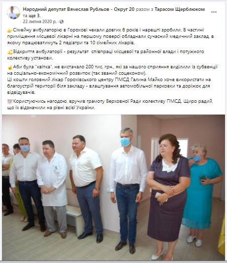 При цьому головна лікарка лікувального закладу, разом з Рубльовим виступаючи перед колективом на відкритті реконструйованого об’єкта, хвалить «бюджетних благодійників». Все це висвітлюють місцеві ЗМІ. Але не треба забувати, що вона – членкиня партії «За майбутнє», балотувалася за списками цієї партії до Горохівської міської ради та отримала депутатський мандат.