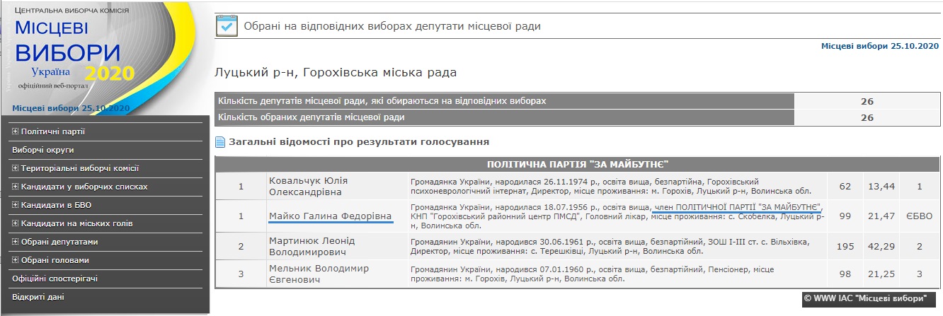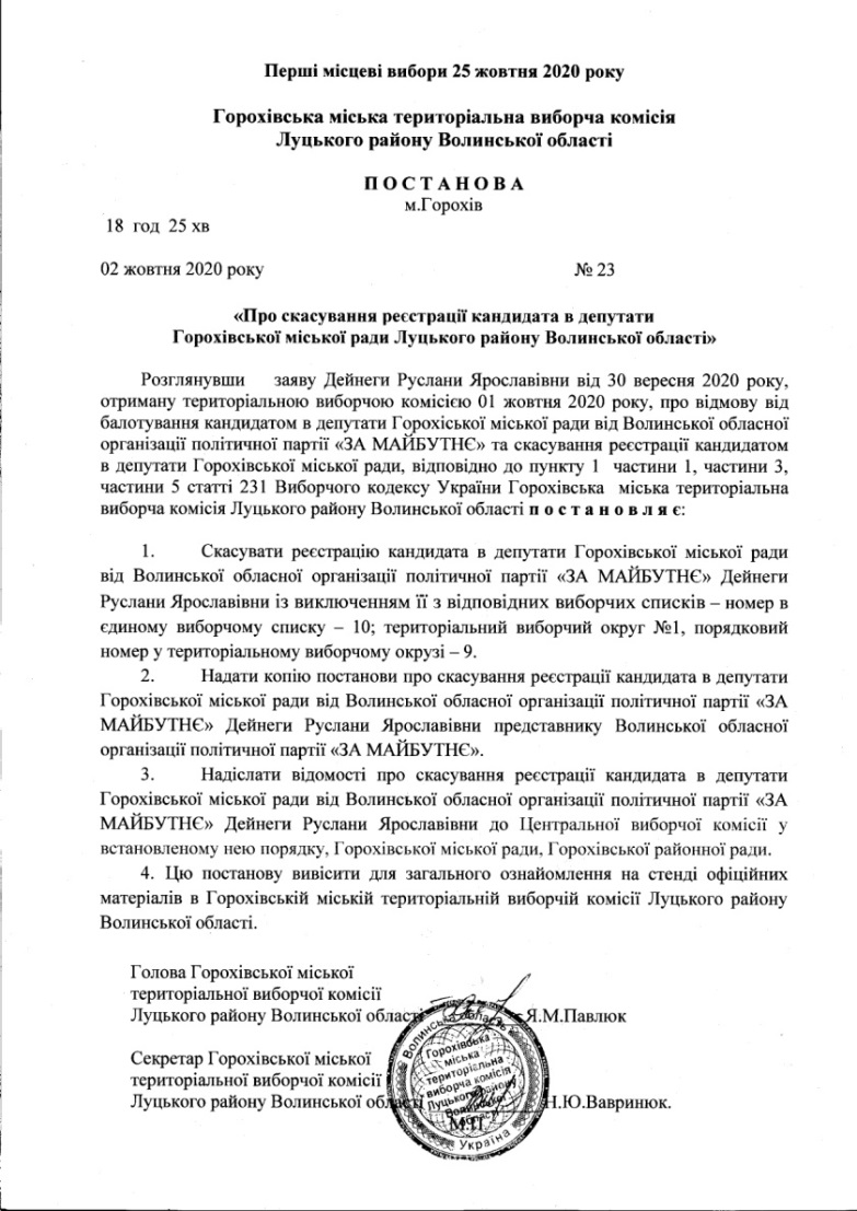 У відкритому доступі також міститься постанова Горохівської міської ТВК від 02 жовтня 2020 року про скасування реєстрації кандидата в депутати міської ради від обласного осередку партії «За майбутнє» Дейнеги Р.Я. на підставі відповідної заяви.