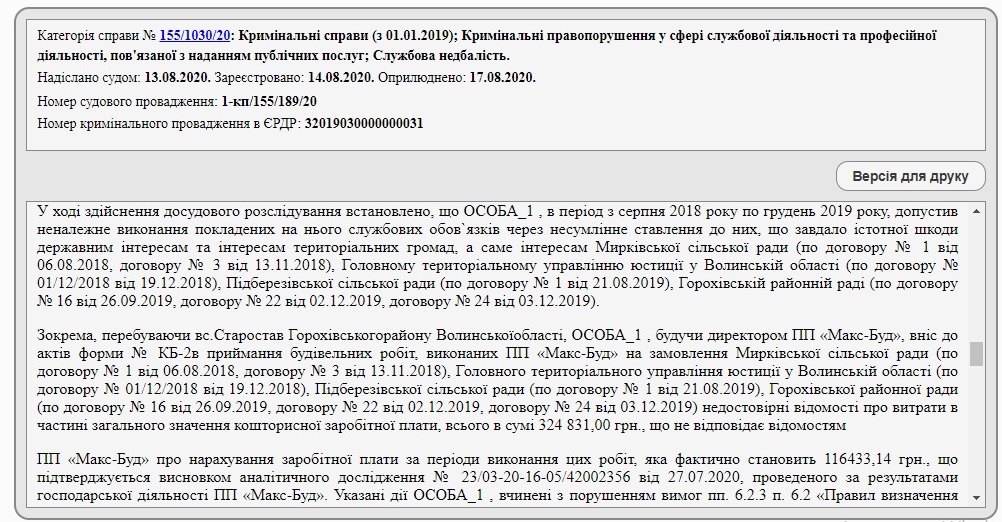 Цікавим є питання вибору виконавця робіт і його доброчесності при використанні бюджетних коштів. У загальнодоступному реєстрі судових рішень міститься ухвала Горохівського районного суду по справі №155/1030/20 від 12.08.2020, відповідно до якої на директора підприємства «Макс-буд» було відкрито кримінальну справу, яка дійшла до суду. Так, в ухвалі зазначається, що внаслідок дій посадових осіб підприємства інтересам Мирківської сільської ради, Головному територіальному управлінню юстиції у Волинській області, Підберезівській сільській раді, Горохівській районній раді завдано істотної шкоди у вигляді надміру сплачених за виконані роботи коштів на загальну суму 208397,86 грн.