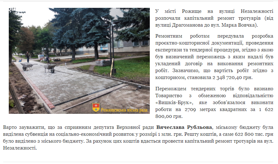 Аналогічна ситуація, коли замовник та виконавець є прихильниками та кандидатами партії «За майбутнє», склалася з ремонтом тротуарів у місті Рожище. Офіційна сторінка міської ради активно висвітлювала процес ремонтних робіт та повідомляла про «мільйон Рубльова». У повідомленнях на сайті містяться тексти з подяками народному депутату В. Рубльову як під час процедури виділення бюджетних коштів, так і виконання будівельних робіт.