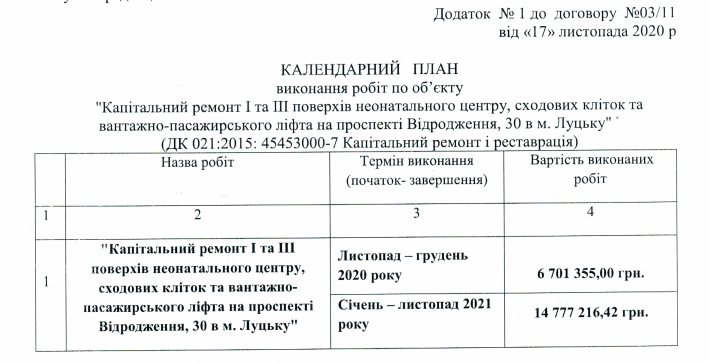 У жовтні 2020 року ПрАТ «Луцьксантехмонтаж №536» виграло тендер на суму 27,4 млн грн для здійснення ремонту неонатального центру у м. Луцьку. 17 листопада 2020 року товариством з КП «Волинське обласне територіальне медичне об'єднання захисту материнства і дитинства» Волинської обласної ради укладено договір на виконання будівельних робіт. Кінцевий термін виконання робіт згідно з договором – 30 листопада 2021 року.