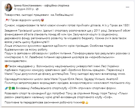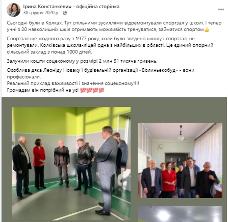 За рахунок «депутатської субвенції» у 23 окрузі Ірини Константевич ремонтували школу в с. Гірки та спортзал смт Колки. Традиційно розпорядники коштів субвенції мають відношення до політичної сили «За майбутнє». Замовником ремонту спортзалу був відділ освіти Колківської селищної ради, начальник якого Леонід Новак балотувався на посаду селищного голови від партії Палиці, а село Гірки входить до складу Любешівської ОТГ, у якій головує висуванець від партії «За майбутнє» Кух Олег Іванович.