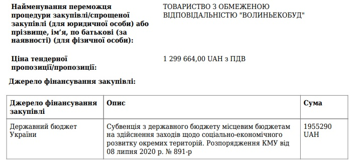 | 19 | Нове будівництво адмінбудівлі стадіону та трибун по вул. Незалежності в смт Люблинець Ковельського району Волинської області | 4 529 813,00 | Департамент інфраструктури Волинської ОДА | ТОВ «Волбуд», 40299777 |
