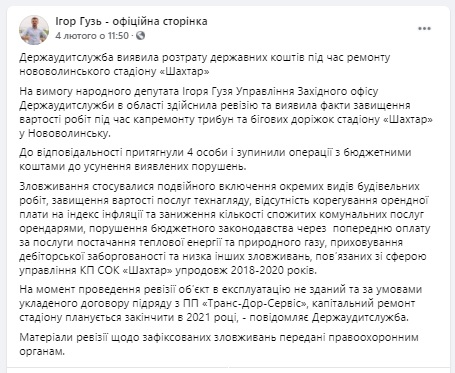 Заразом на початку 2021 року активізується нардеп Ігорь Гузь, який публікує на власній сторінці у фейсбуці інформацію про зупинення Держаудитслужбою фінансування капітального ремонту трибун та бігових доріжок на «Шахтарі».
