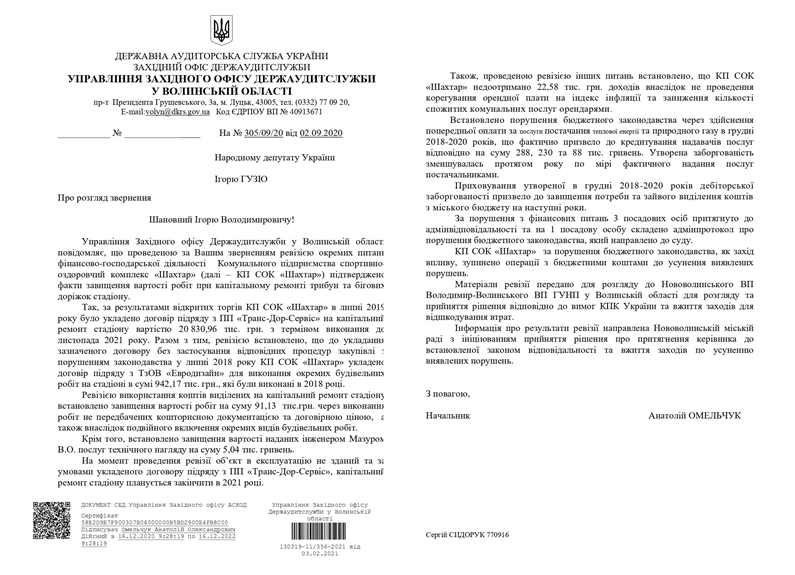 По-друге, більшість зауважень, які викладені у листі-відповіді Держаудитслужби, не відноситься до договірних відносин між КП СОК «Шахтар» та ПП «Транс-дор-сервіс» та не пов’язані з виконанням робіт за цим договором. Взагалі лист Волинського представництва Державтодору не містить відомостей, що порушення відбулися під час виконання цього договору, а містить лише посилання, що підприємство виконує роботи з капітального ремонту стадіону до 2021 року.