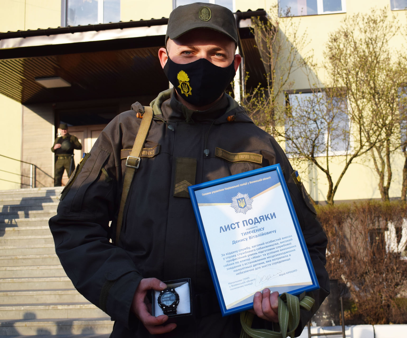 Подяку та цінний подарунок (наручний годинник) отримав сьогодні кінолог військової частини 1141 НГУ сержант Денис Тимченко, а його напарниця, службова вівчарка Ніка – корм для собак. Вручив нагороди заступник начальника ГУ Національної поліції у Волинській області Сергій Козак.