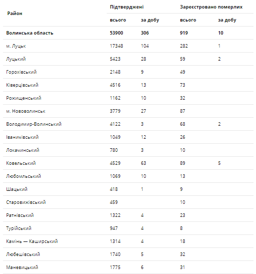 За останню добу на Волині зареєстровано 306 нових підтверджених випадків коронавірусної хвороби COVID-19 (з них дітей – 29, медпрацівників – 12). Одужало за добу – 436 осіб, летальних випадків – 10.